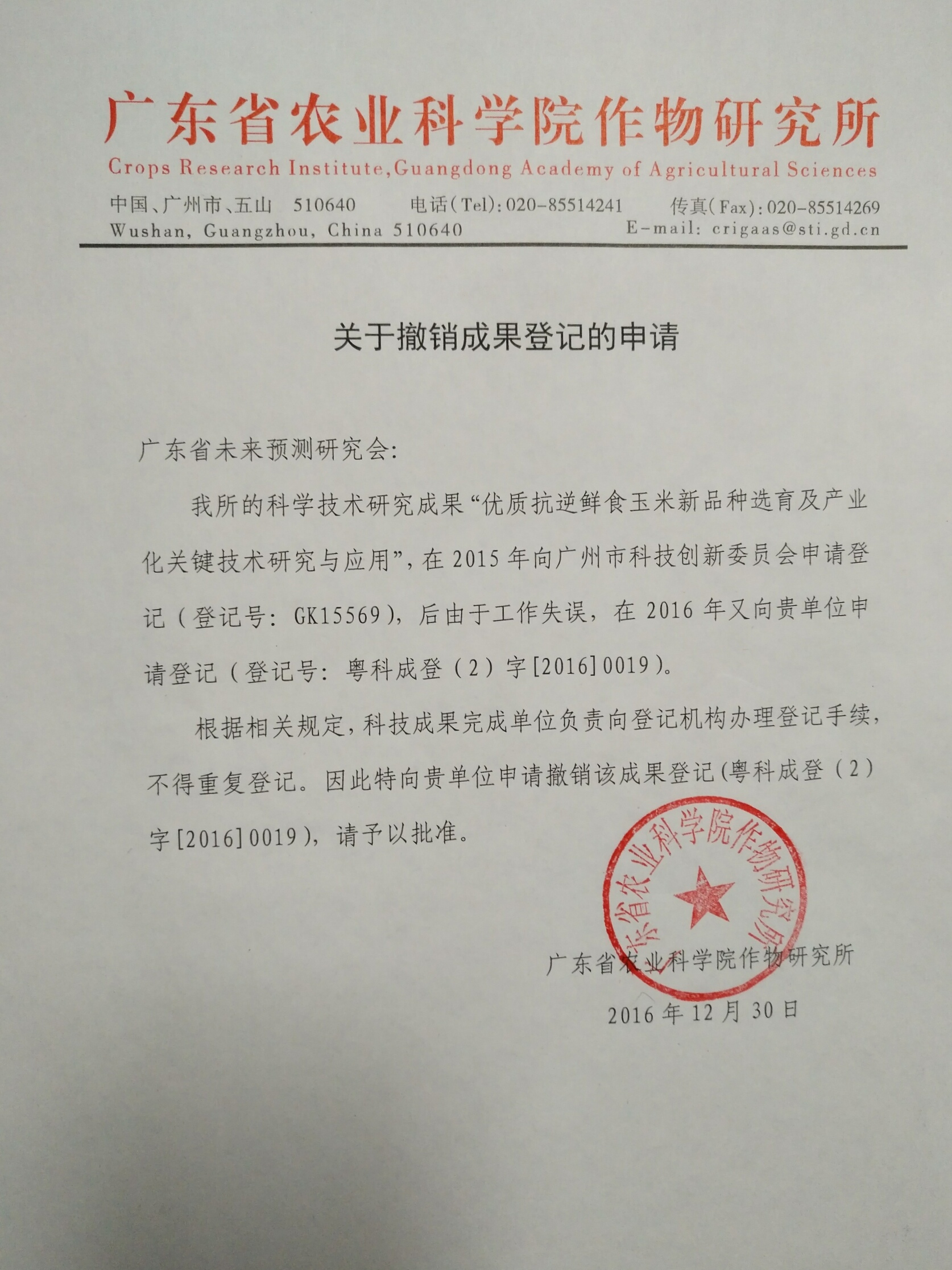 广东省农业科学院作物研究所关于撤销成果登记的申请